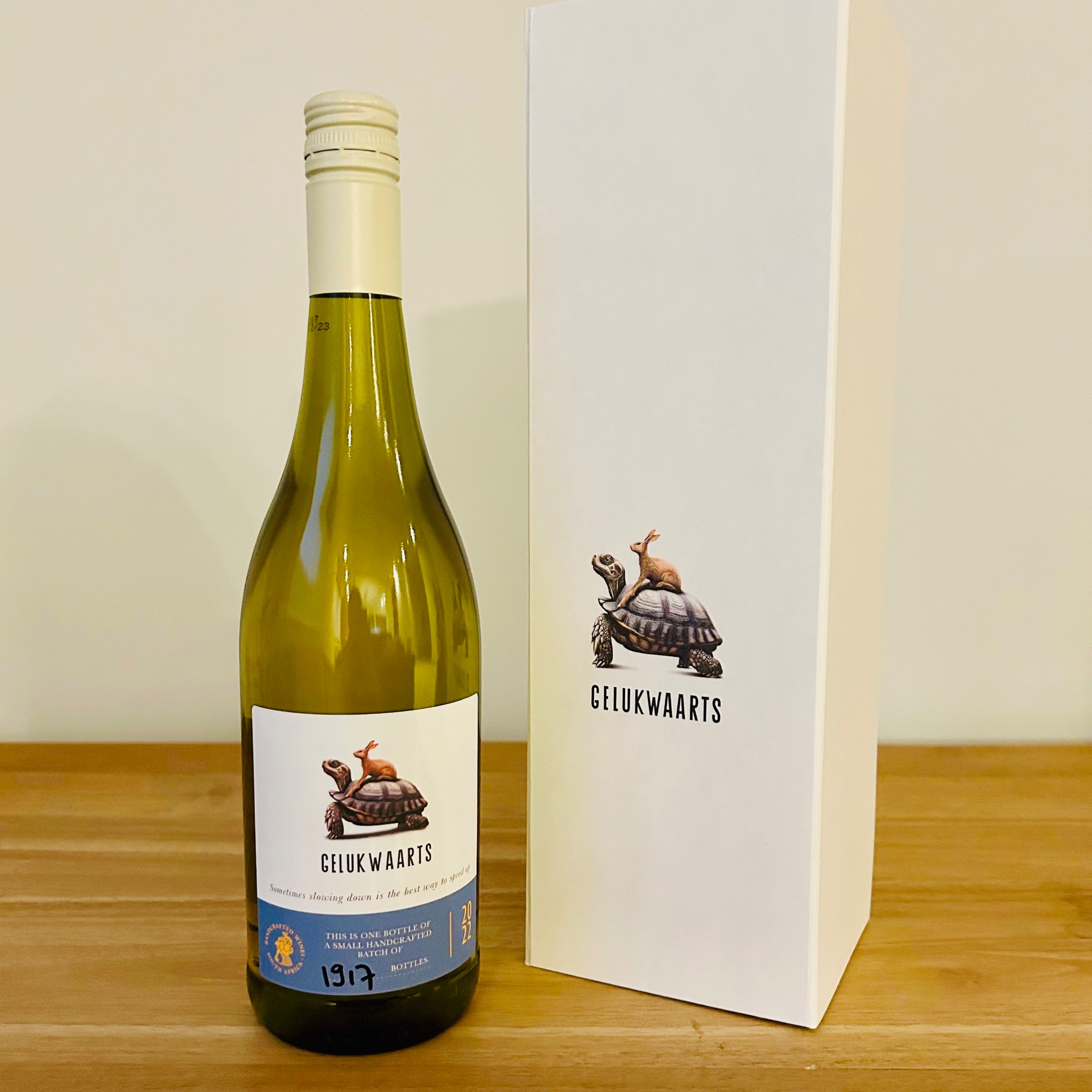 Gelukwaarts Chardonnay Box bevat 1 fles Chardonnay (2022) in een luxe bewaardoos waarin je achteraf je herinneringen kan bewaren.